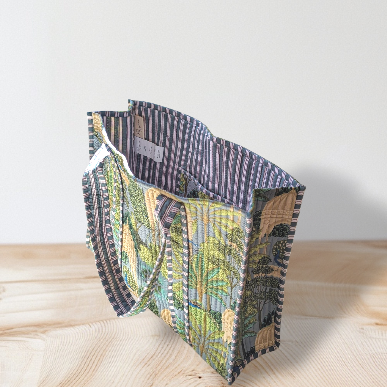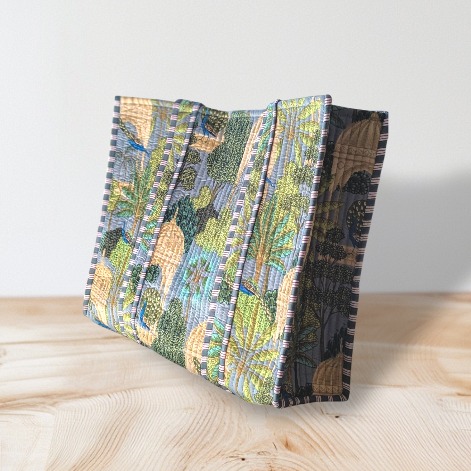 Sariska, this tote draws its inspiration from wildlife terrain and palace architecture, brought to life by its hand screen-printed pattern, in a sky blue with shades of green and sand stone. The interior carries a color coded stripe pattern.
