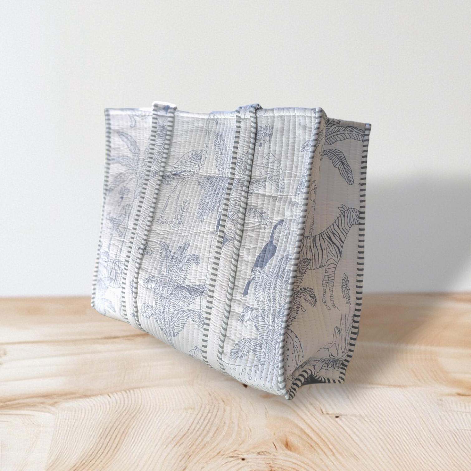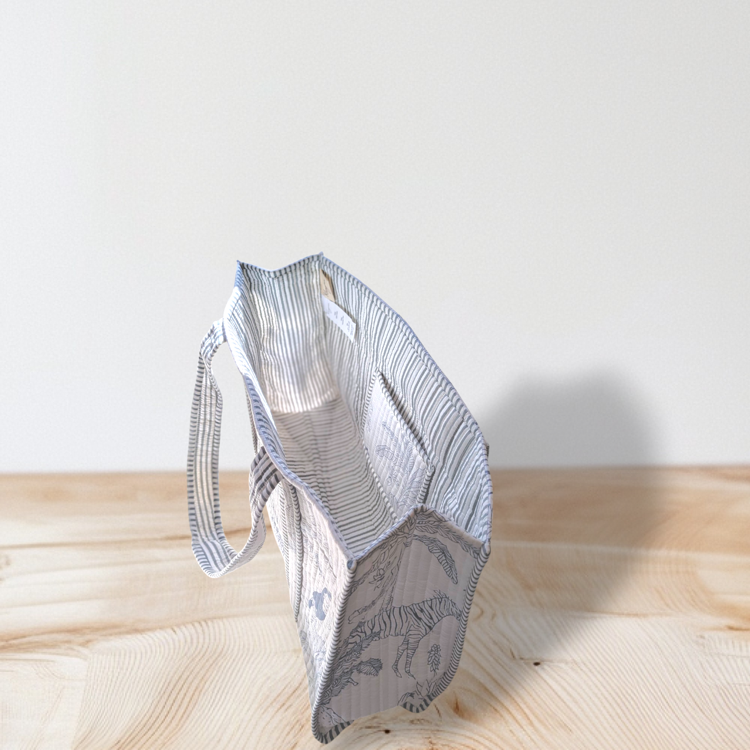 Talamanca, this tote reflects a lush, biodiverse landscape with its hand screen-printed motifs of birds and animals, in a soft bluish-grey against a white background. The interior carries a color coded stripe pattern.
