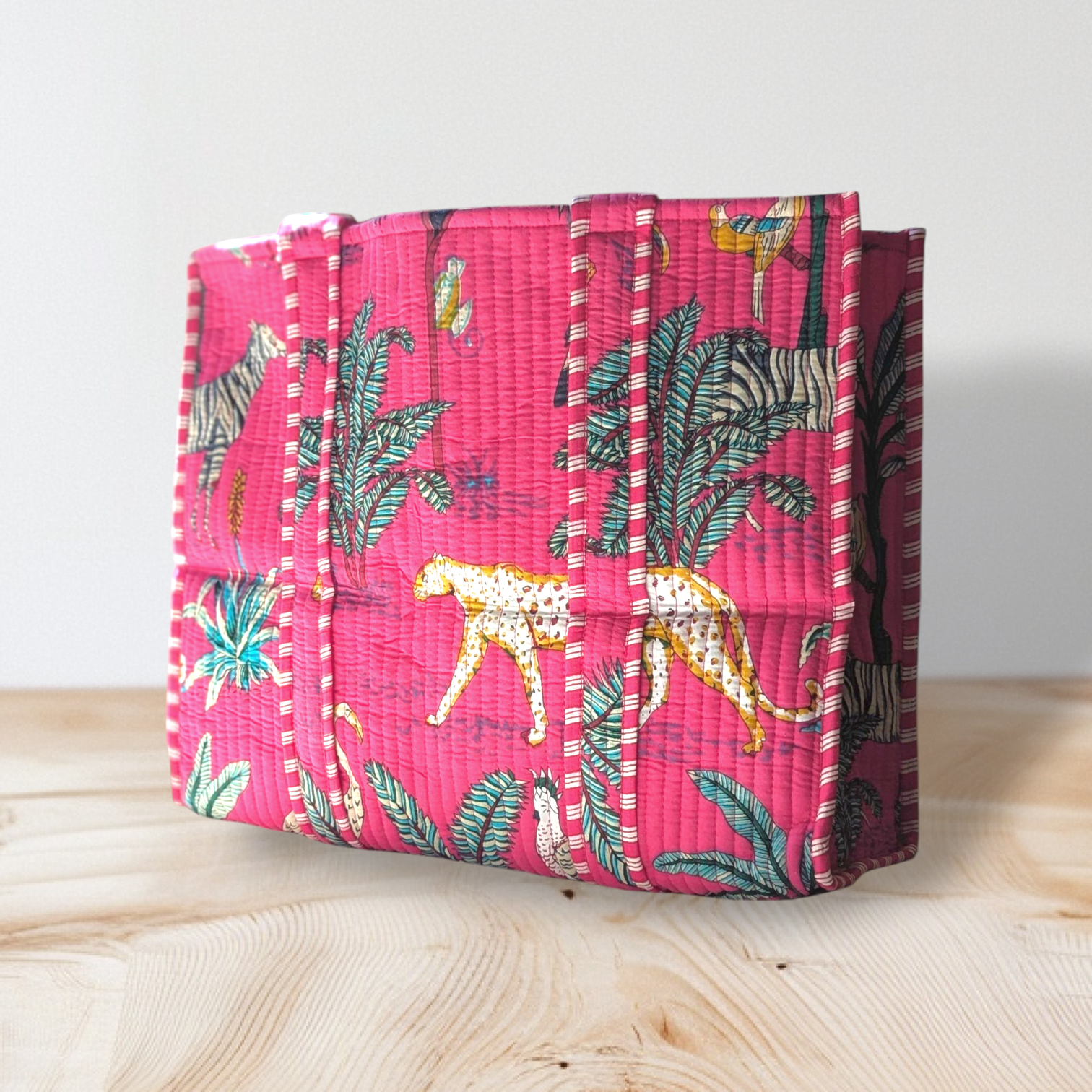 Tarangire, this tote carries the spirit of the wild with its hand screen-printed animal motifs on a bright pink background. The interior carries a color coded stripe pattern.