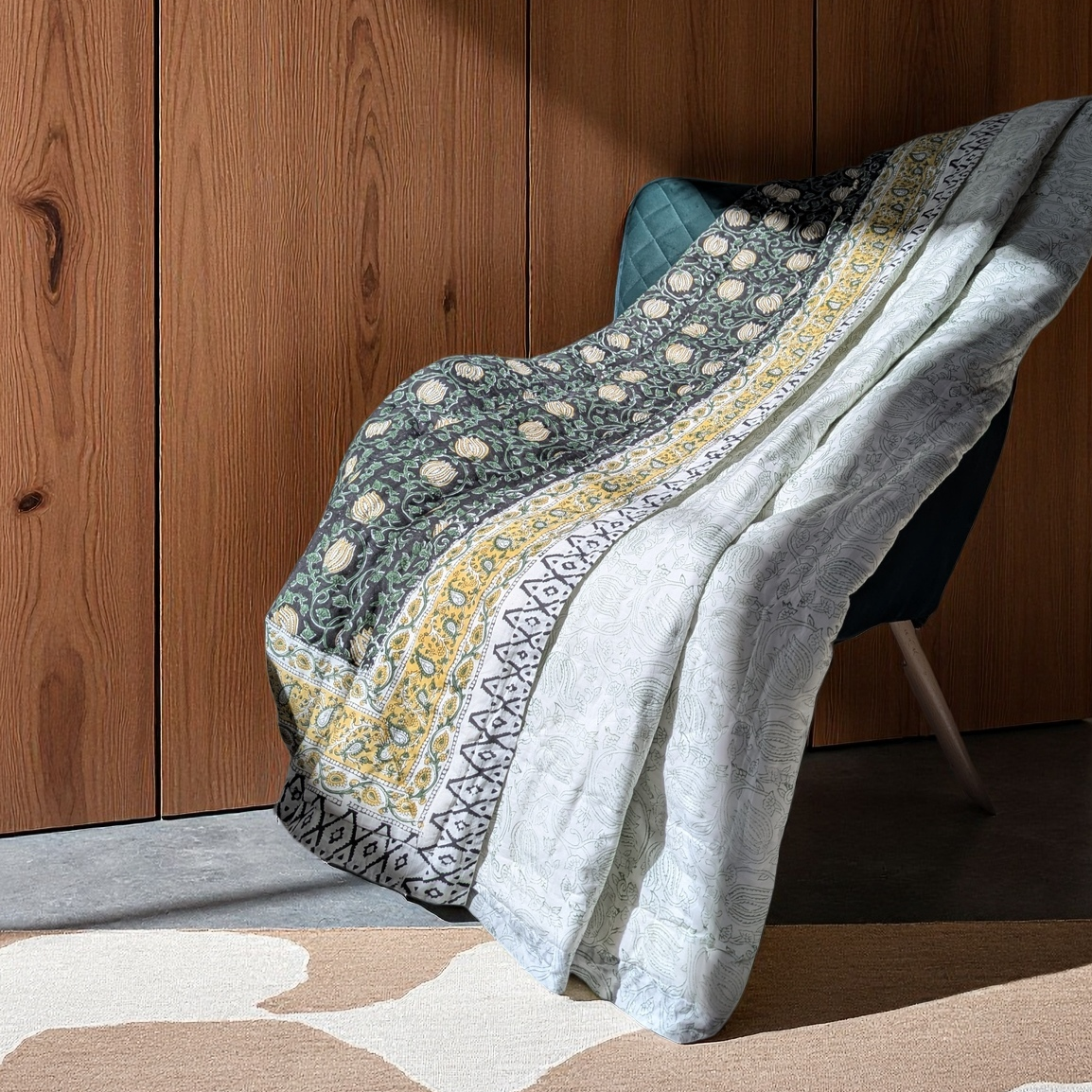 Woodland Bloom unfolds in shades of moss and gold, with lotus florals on one side and a sketched vine motif on the reverse. Printed on breathable cotton, this reversible quilt is soft, airy, and easy to layer year-round.